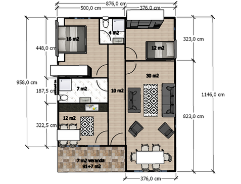 Планът за сглобяема къща е изготвен за вас. Ако желаете, може да се приложи различен план на къщата и екстериорен дизайн специално за вас.